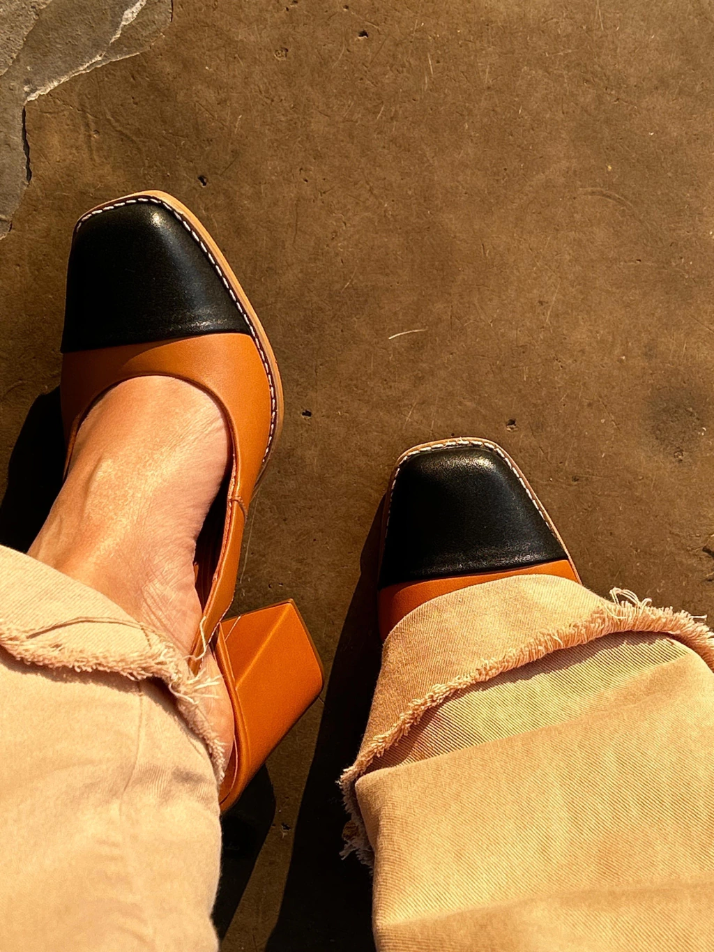 O SLINGBACK tem o material em couro sintético marrom, possuindo biqueira preta fosca, também em couro sintético e elástico no tornozelo, que possibilita melhor ajuste no pé, bico redondo, salto bloco quadrado cm. Forma certa, mas para pés magrinhos, recomendamos um tamanho menor.